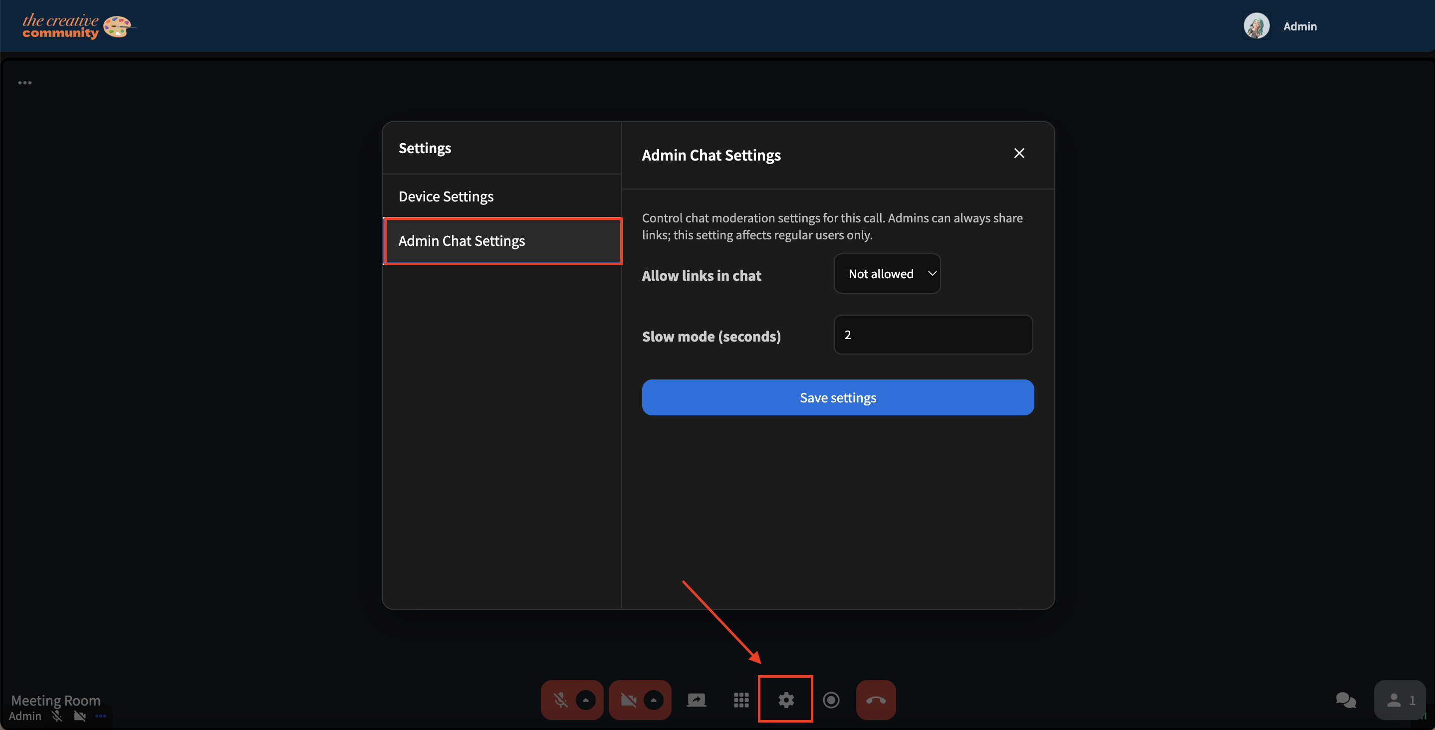 - Enable or disable link sharing in live chat: to allow or block participants to share links in the live chat, go to the Admin Chat Settings (by clicking on the settings icon and the Live Chat Settings).