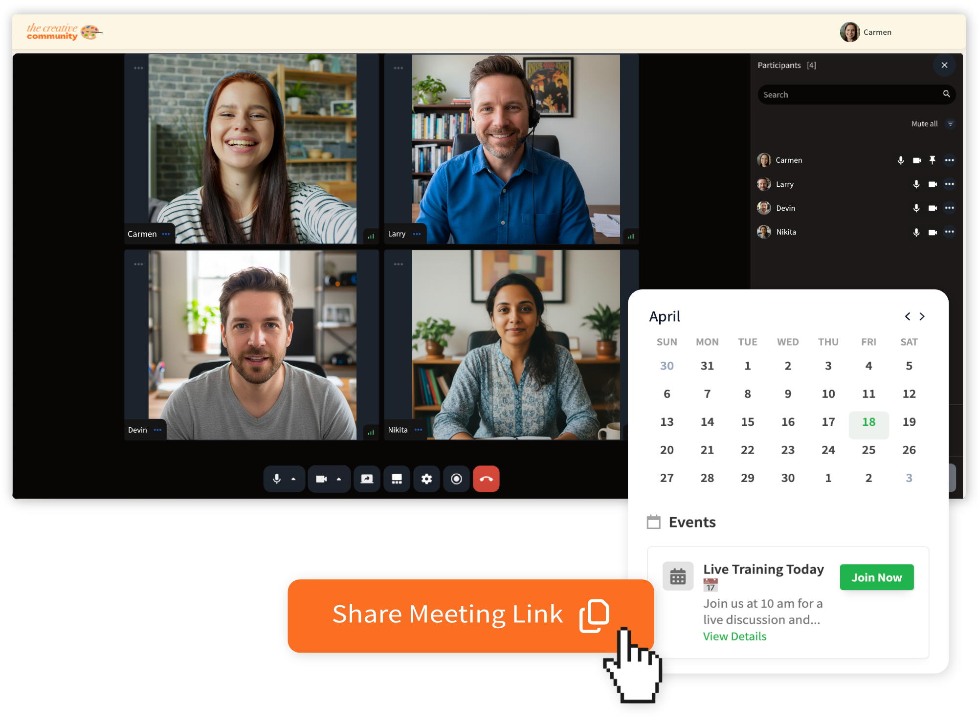 - Community Streams and Meeting Rooms: Start live discussions, mastermind calls, or Q&A sessions directly inside your community channels.