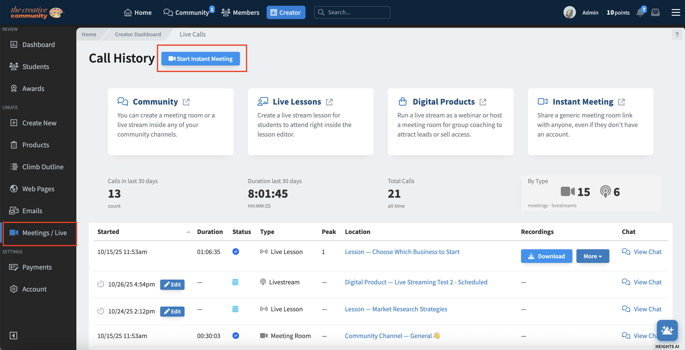 - Use Instant Meetings for sessions that don’t require a course, product, or community setup.